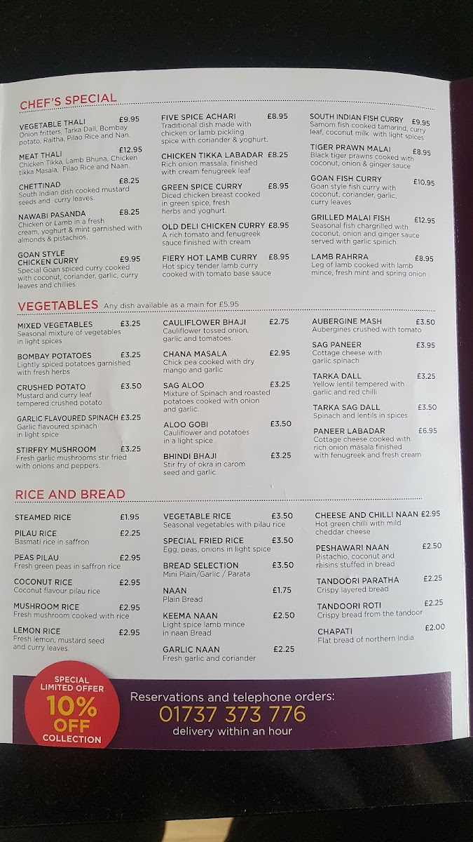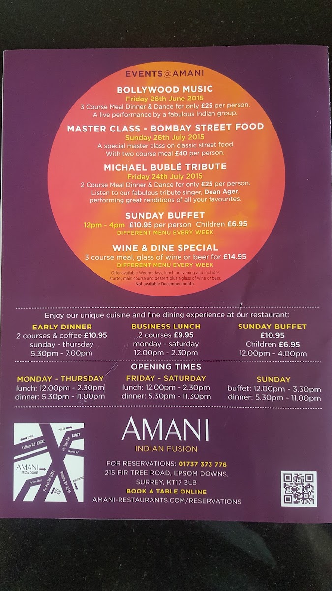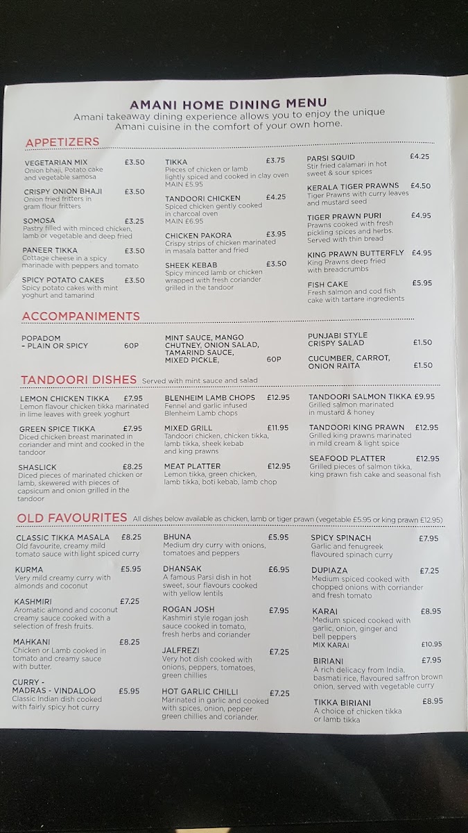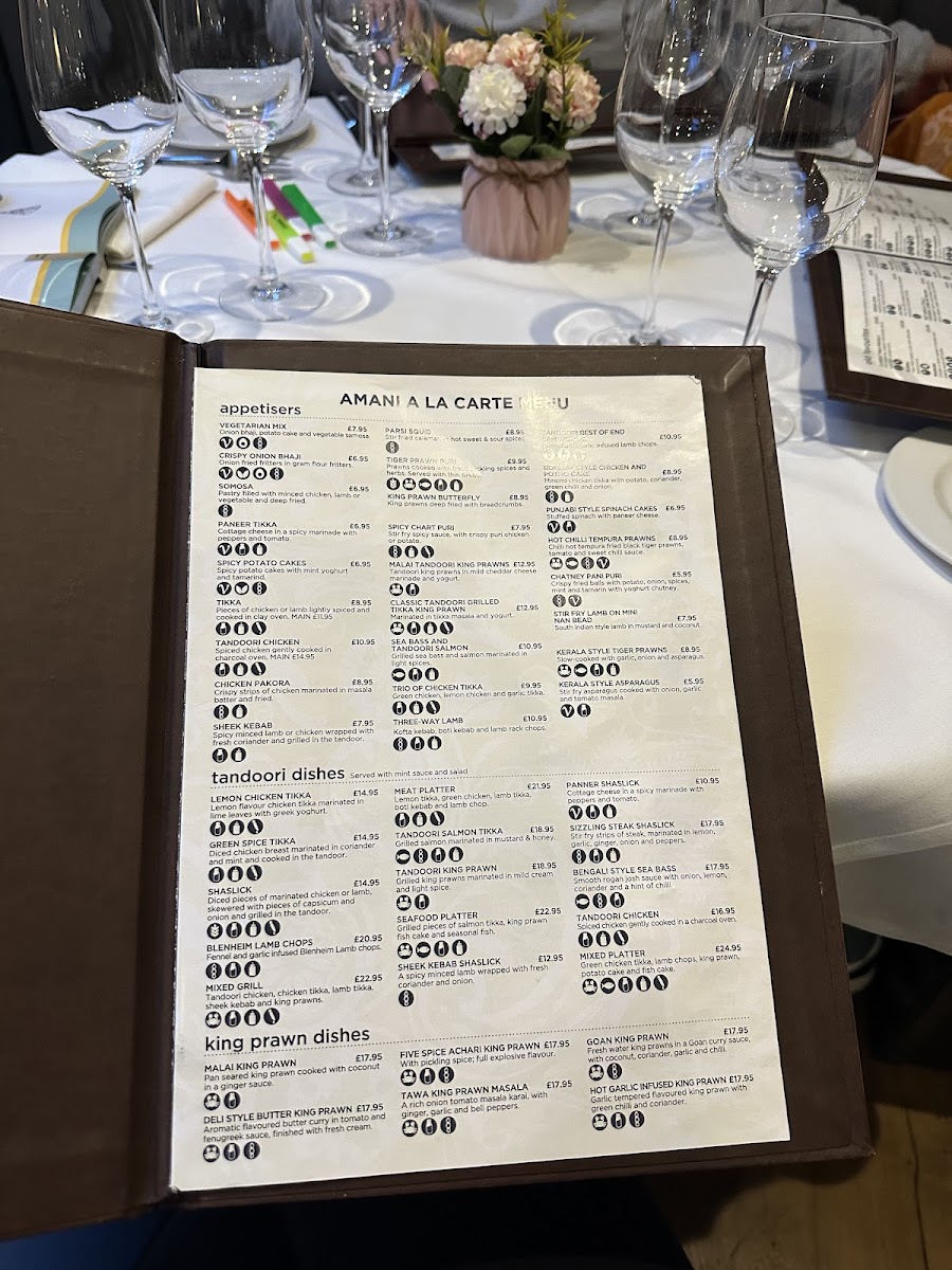 Amani, located in Epsom, welcomes you to a culinary haven filled with authentic flavors and exquisite dishes. The menu offers a delightful array of tandoori favorites, with the ThreeWay Lamb (£10.95) and Hot Chilli Tempura Prawns (£8.95) leading the charge. For those seeking chef’s specials, indulge in the Lamb Shank (£19.95) or savor the Tiger Prawn Malai (£15.95). Each dish is crafted with passion, reflecting the dedication of its culinary team.
